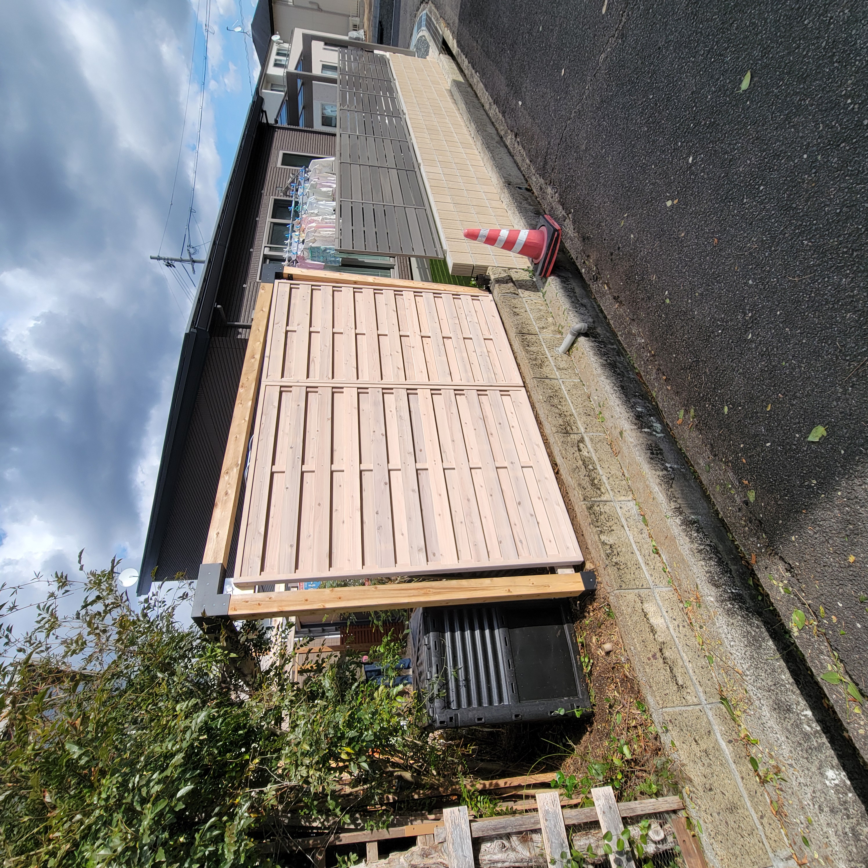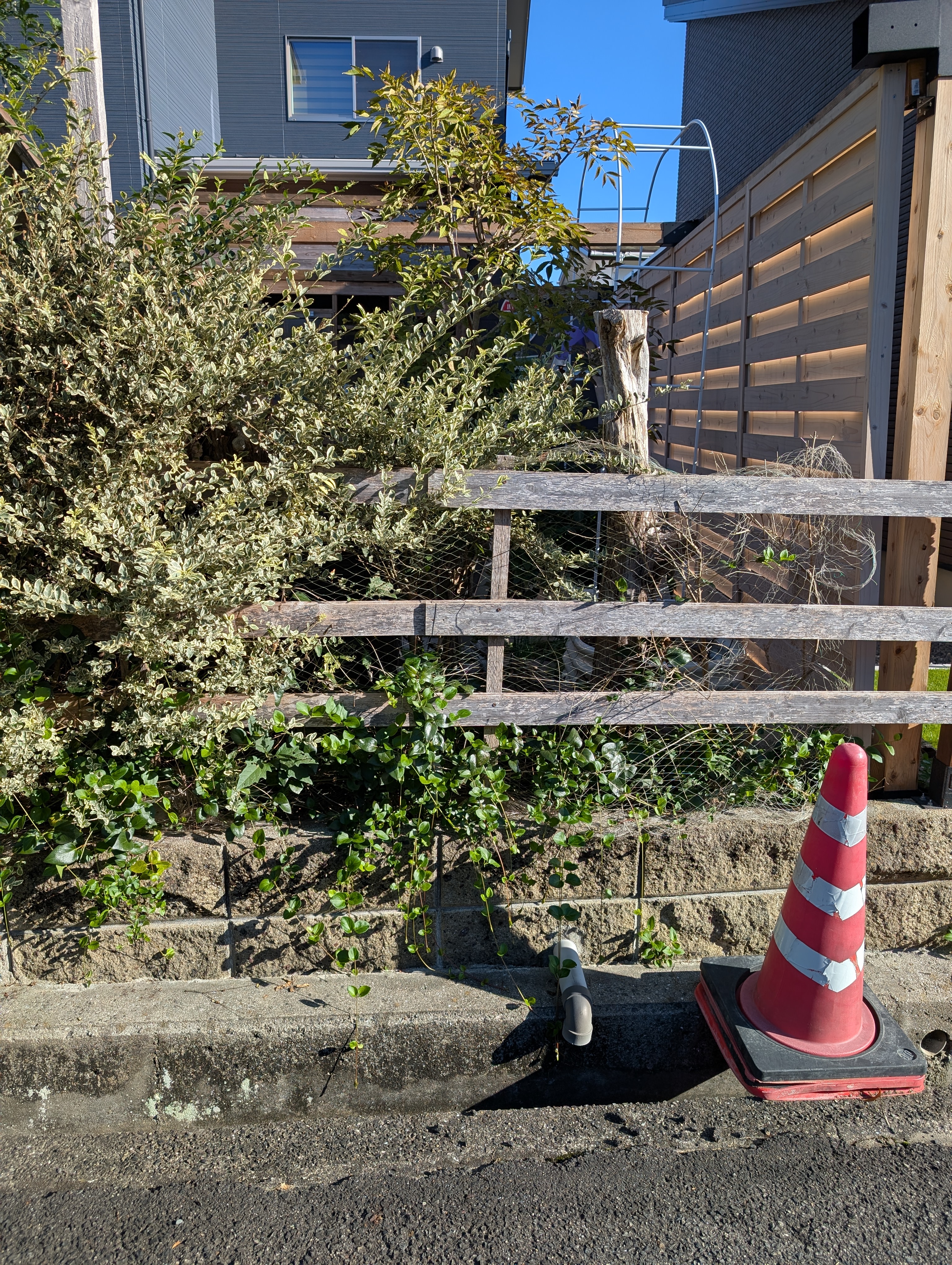 画像に映っている枯れ木(3本ある)の抜根と、側面に設置されたフェンスを正面にも設置してほしいとのことでして